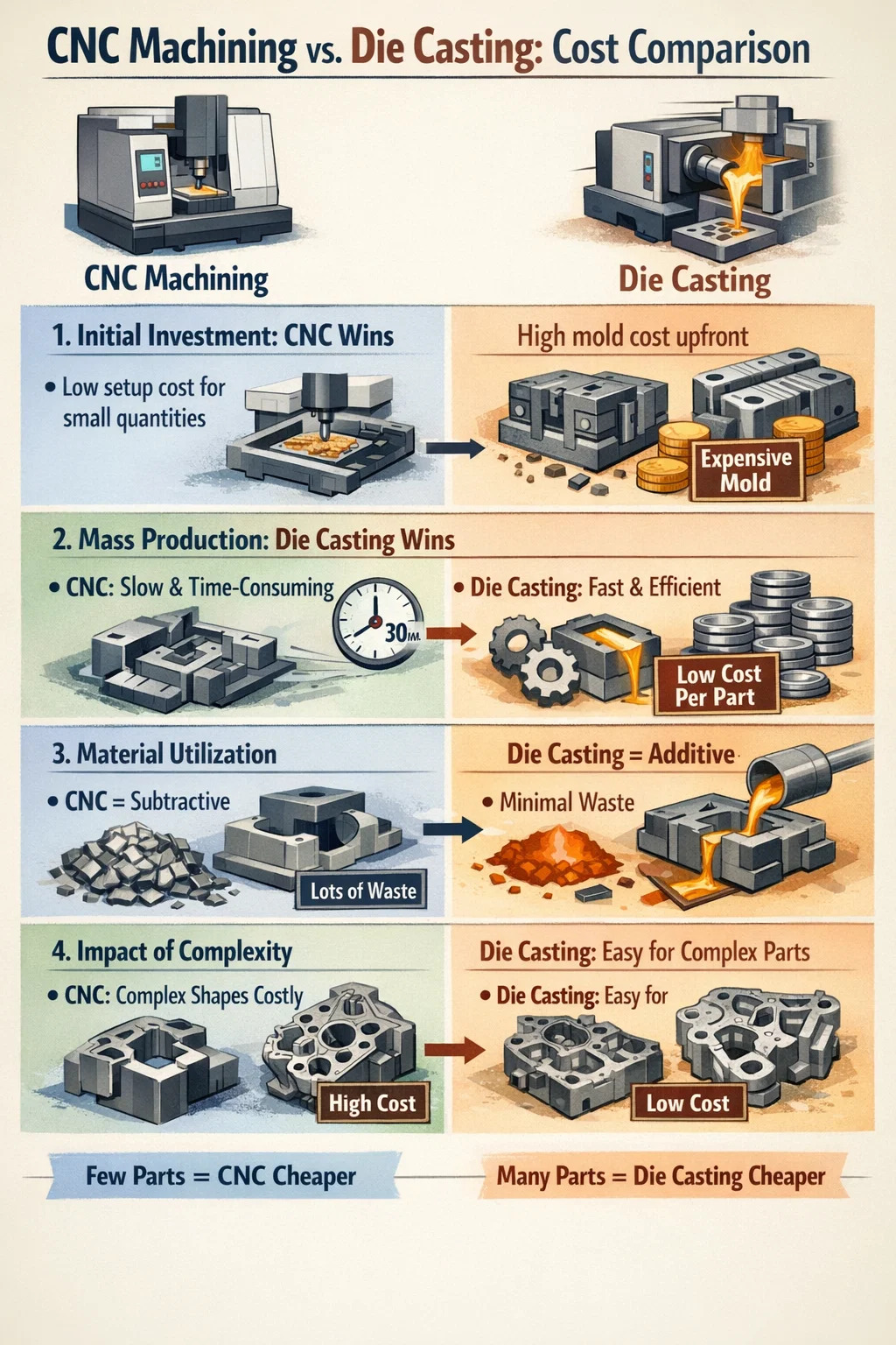 La velocidad determina el costo: la fundición a presión puede "producir" una pieza en segundos, mientras que el CNC puede requerir media hora de trabajo meticuloso. El tiempo es dinero y, en la producción a gran escala, la eficiencia de la fundición a presión puede reducir el coste unitario a un nivel muy bajo.