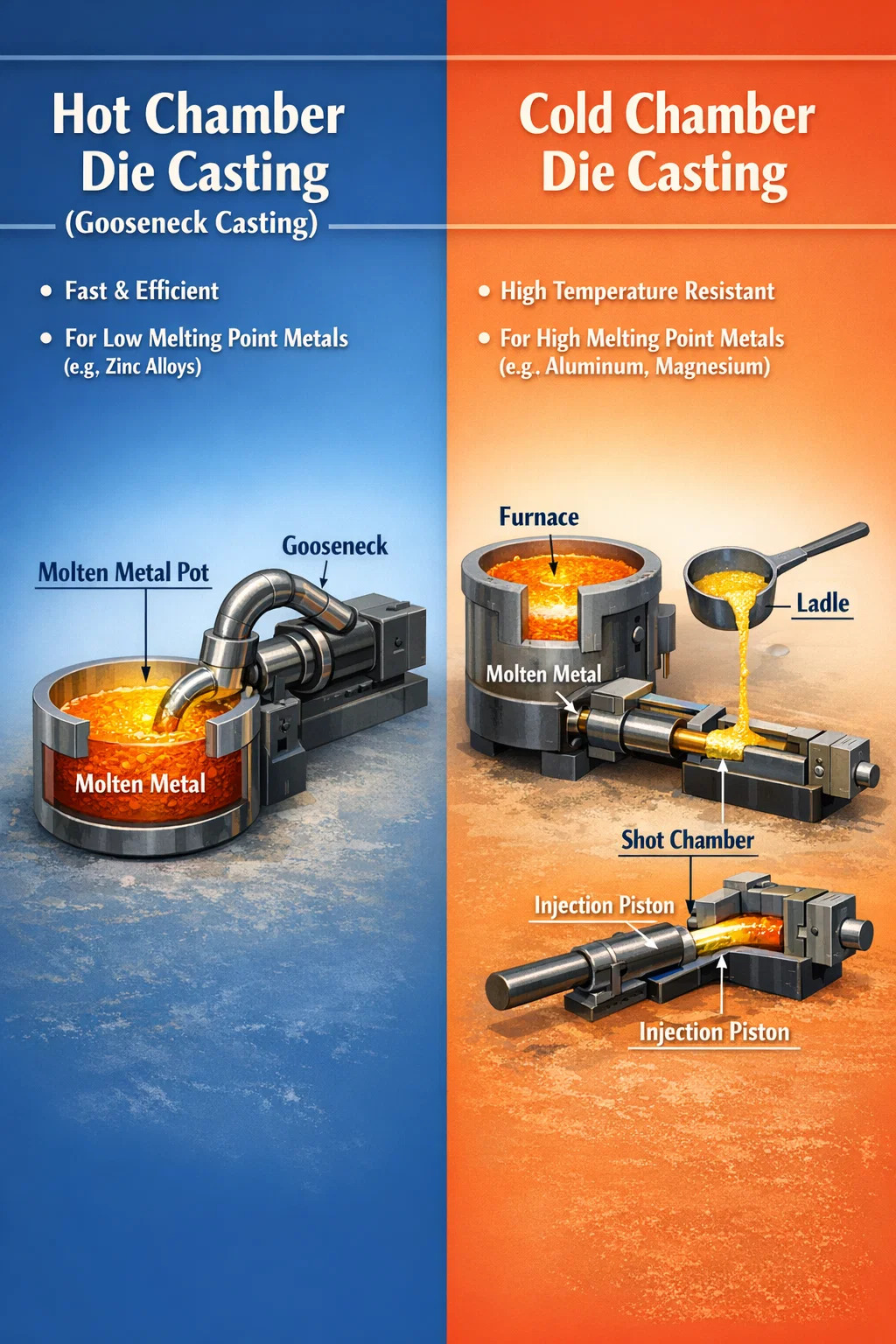 en el mundo de fundición a presión , hay dos categorías principales según cómo se funde e inyecta el metal en el molde: fundición a presión en cámara caliente y fundición a presión en cámara fría.
