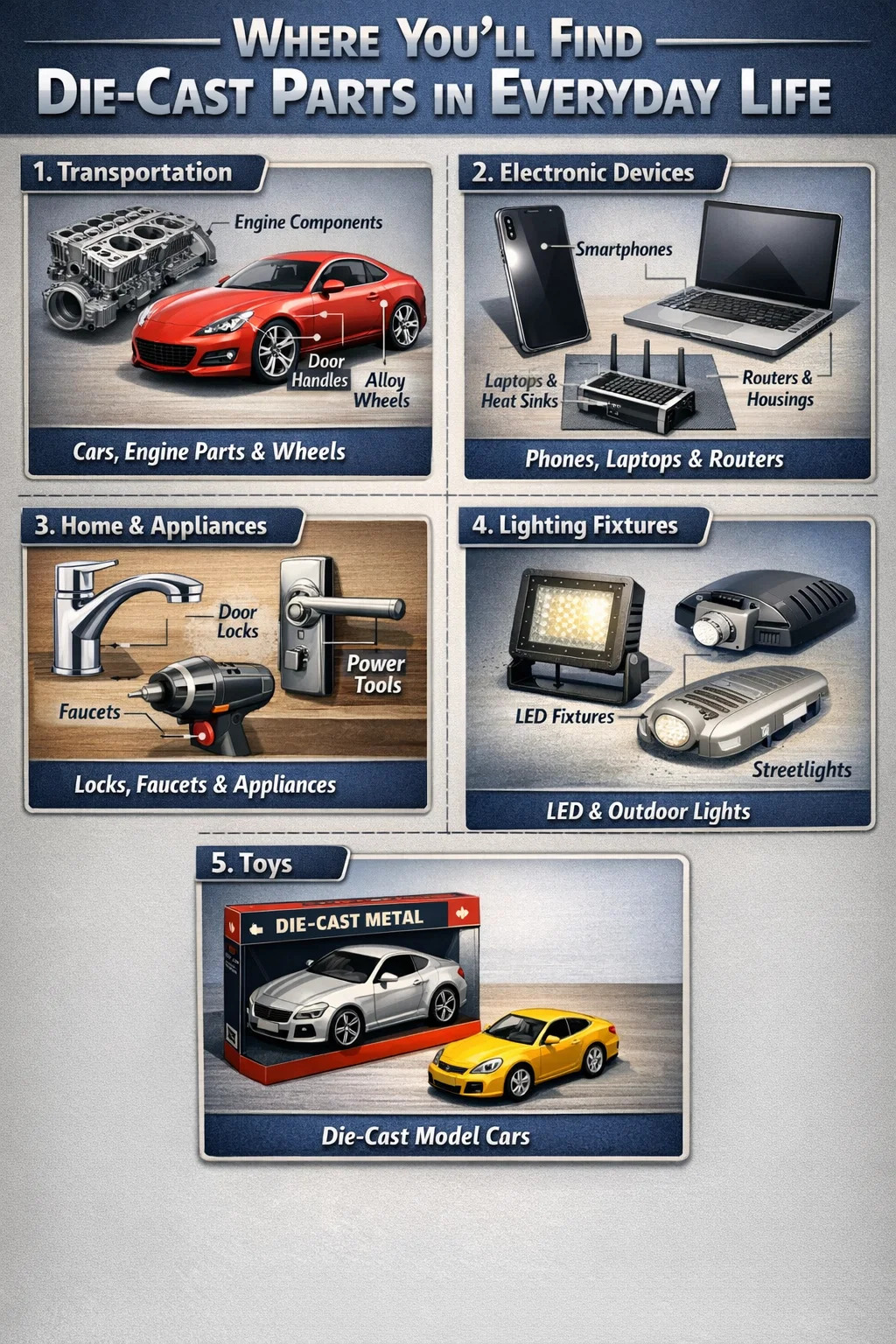 Las piezas de fundición a presión están prácticamente en todas partes de nuestras vidas. Simplemente mire a su alrededor y descubrirá que muchos de los objetos metálicos resistentes, fríos al tacto y de formas intrincadas se fabrican mediante este proceso.